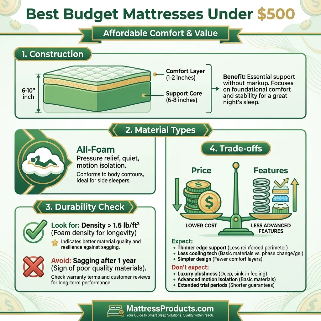 Under $500, you can still get a comfortable, safe, and reasonably durable mattress—if you insist on real specs, buy from official storefronts, and time your purchase to sales. Aim for 10-12" height, comfort foam around 3.0-3.5 lb/ft³, base at 1.8+ lb/ft³, or 600+ pocketed coils for hybrids. Protect it, rotate it, and use a solid foundation. If a listing hides numbers or skimps on trials, keep scrolling; the right budget bed will tell you exactly what it is made of.