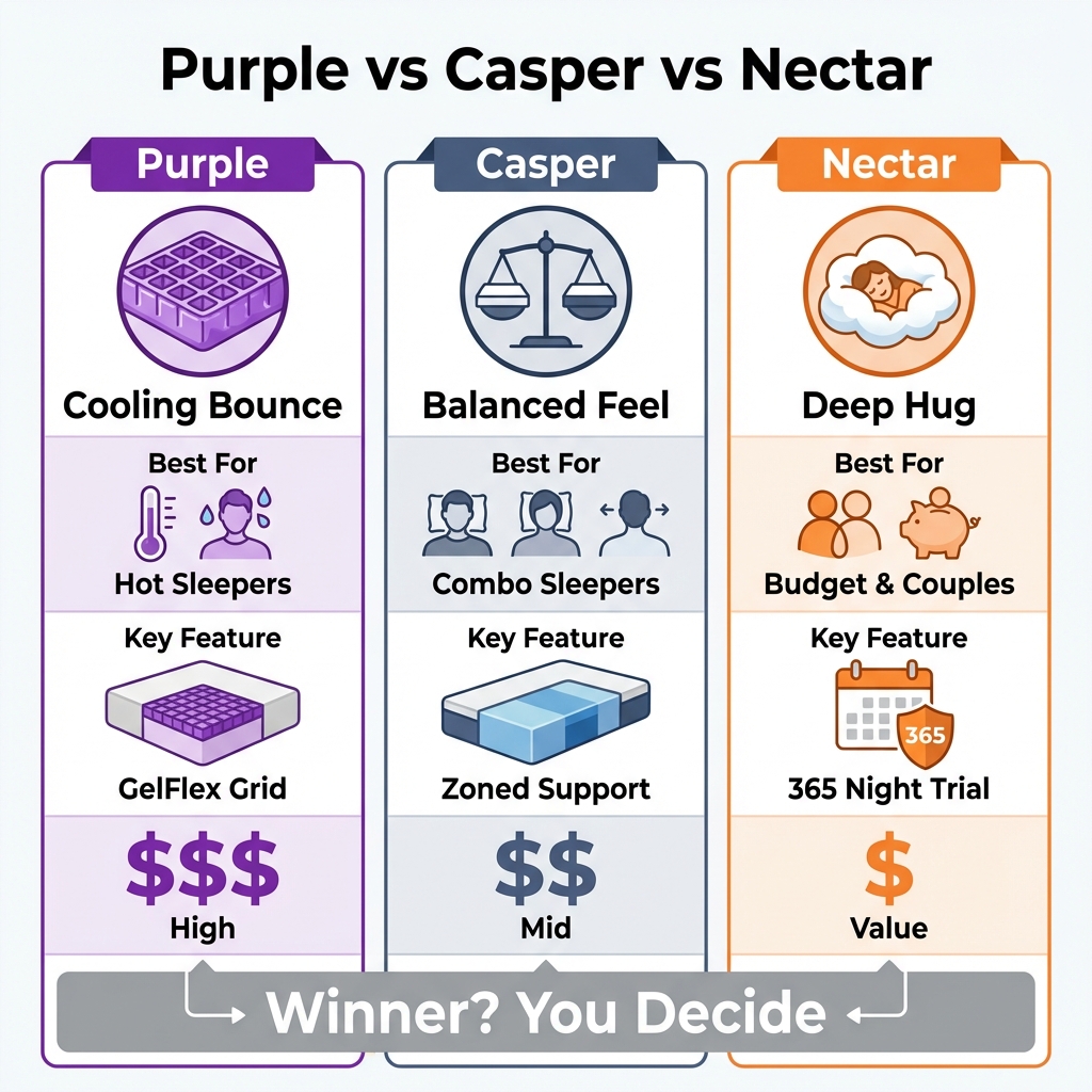 - Fast answer: Purple for hot sleepers and combo sleepers who want bounce; Casper for balanced support and mixed positions; Nectar for value hunters and couples who need motion isolation.